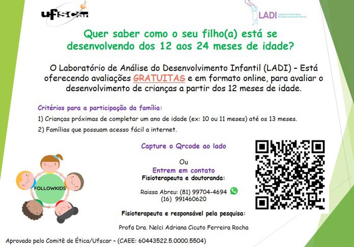 Uma pesquisa de doutorado, desenvolvida no Programa de Pós-Graduação em Fisioterapia da Universidade Federal de São Carlos (UFSCar), está realizando o projeto de avaliação remota das habilidades funcionais e da participação social em crianças a partir de 12 meses. Para isso, familiares ou cuidadores de crianças entre 10 e 13 meses podem participar do estudo que pretende identificar possíveis atrasos no desenvolvimento desses bebês e orientar as famí­lias conforme cada caso.