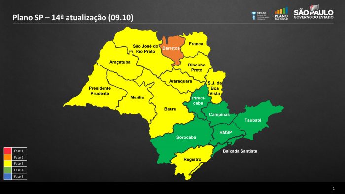 A região Metropolitana de São Paulo e as regiões de Campinas, Sorocaba, Piracicaba, Taubaté e Baixada Santista, conseguiram avançar para a fase Verde, enquanto que a região de Barretos, foi a única do Estado que regrediu para a fase Laranja.
