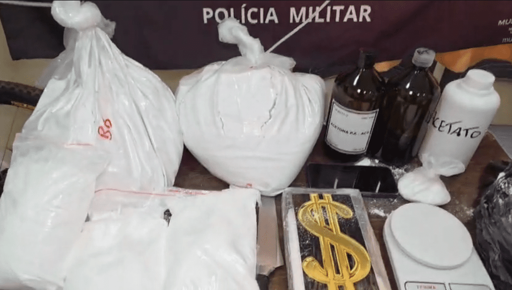 Neste sábado, a Polícia Militar de Jaboticabal realizou uma apreensão de cerca de 1,1 kg de cocaína, um litro acetona, um litro acetato, um litro éter, 28.500 kg de pó químico para aditivar a cocaína, uma balança de precisão, uma faca e um celular Motorola.