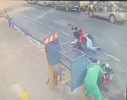 O PM aposentado cai e o homem de verde foge, após roubar sua arma de fogo. Não foi confirmado se os assaltantes conseguiram levar o malote com o dinheiro. Um dos assaltantes parece ter sido ferido, mas corre em direção à Rua São Sebastião.