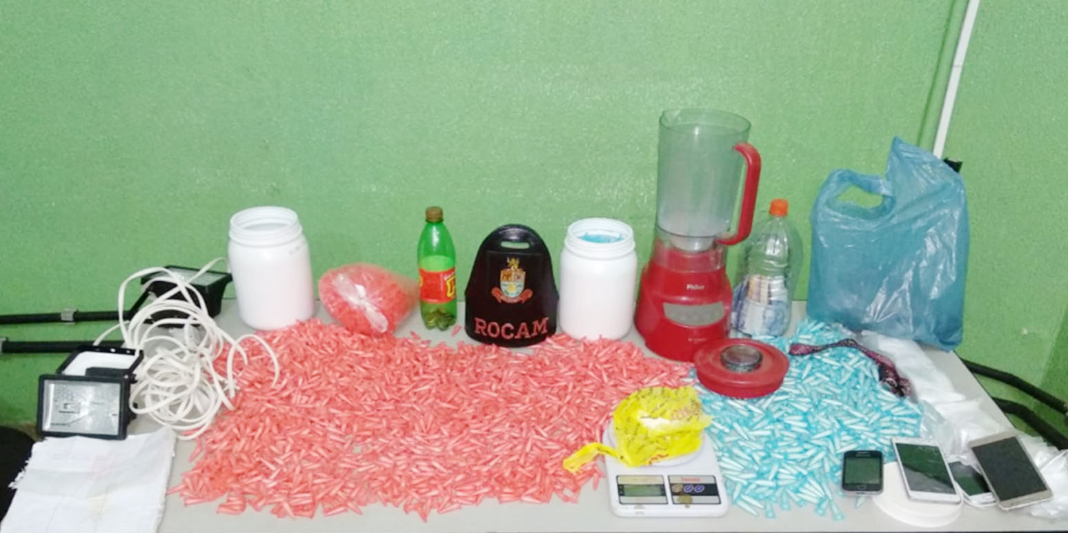 Ele foi abordado e 13 pinos de cocaína foram apreendidos no bagageiro do veículo. Dentro do imóvel precário, três suspeitos e um adolescente tentaram fugir quando os policiais militares entraram, mas foram detidos. No boletim de ocorrência foi relacionado que foram apreendidos 2.466 pinos com cocaína e um saco da mesma droga em granel, totalizando aproximadamente três quilos do entorpecente, além de balança de precisão, tesoura, liquidificador usado para “batizar” o tóxico, refletor para acelerar a secagem do pó, 1.8 mil pinos vazios, material para embalagem e R$ 122,55 em dinheiro.