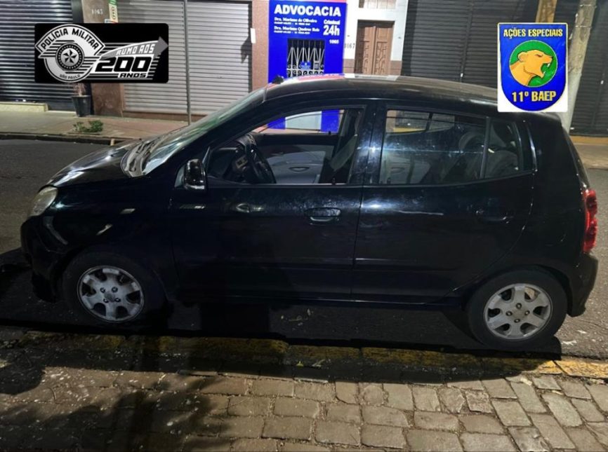 O I/Kia Picanto foi visto com dois ocupantes trafegando pela Rua Rio Bonito e a viatura fez o acompanhamento. O veículo entrou na Travessa Mórros e parou na Rua Avanhandava. O motorista já tinha descido e fugido do local.