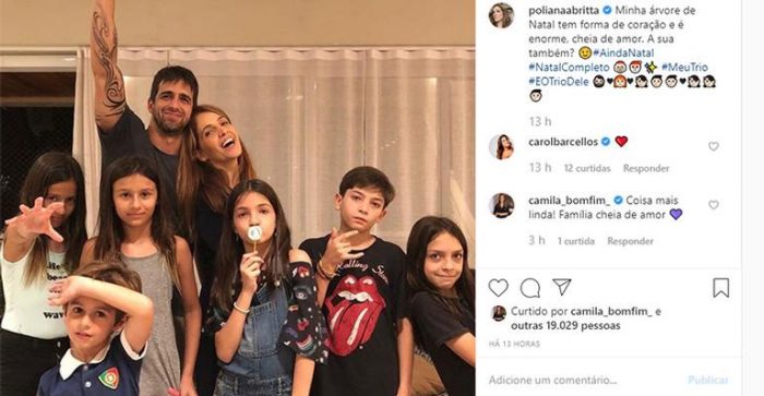 “Minha árvore de Natal tem forma de coração e é enorme, cheia de amor. A sua também?”, escreveu ela na legenda e completou com hashtags que diziam “Natal completo”, “meu trio”, “e o trio dele”.