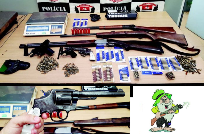 Segundo o boletim de ocor­rência, foram apreendidas seis armas: uma pistola 380, um re­vólver calibre 38, uma pistola 635, uma espingarda calibre 12, uma espingarda calibre 38 e uma espingarda calibre 22. Foram re­colhidas munições de vários ca­libres. Sete cartuchos calibre 12, 98 calibre 38, 340 calibre 22, 69 calibre 380 e 45 calibre 635.