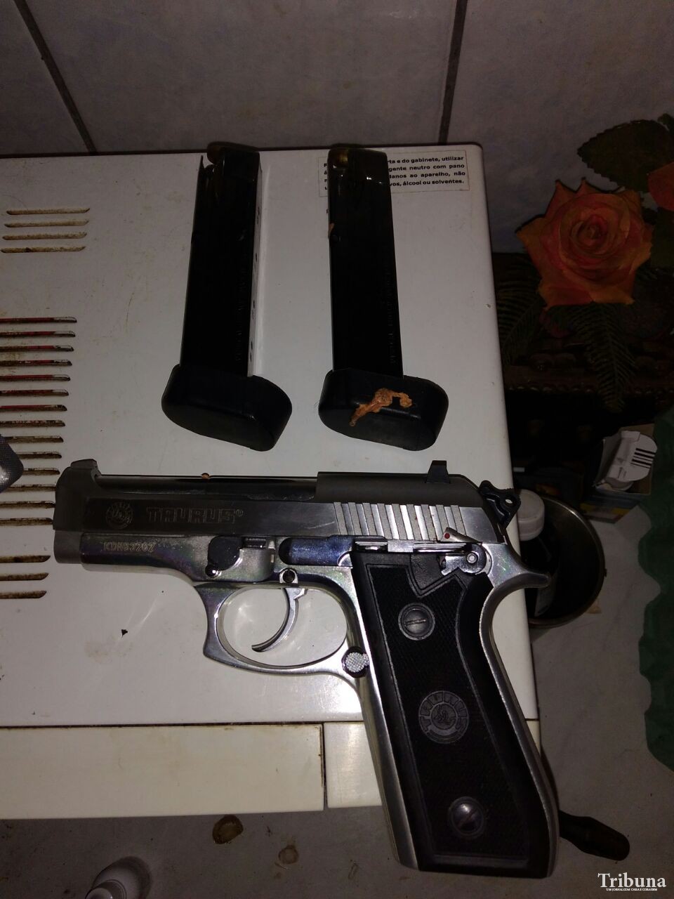 Em outro imóvel, os policiais encontraram um “cofre” instalado na parede e dentro dele uma pistola 380 com dois carregadores e dinheiro.