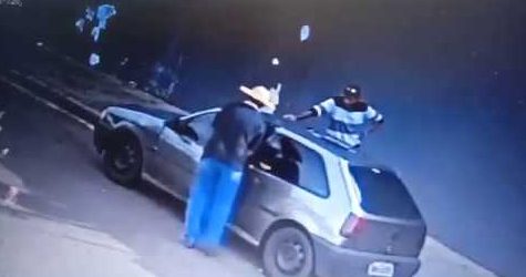 Registrada por câmera de segurança, a dupla se aproxima do veículo e um dos criminosos consegue abrir a porta. A ação rápida dos bandidos não chama a atenção de outros carros que passam pelo local.