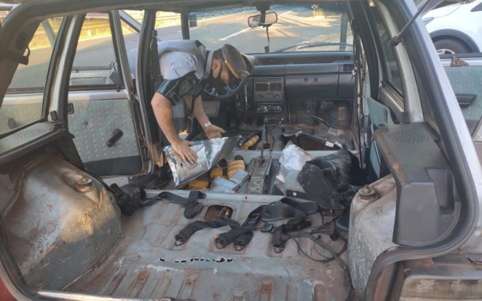 Diante da suspeita, foi realizada uma minuciosa busca veicular, sendo localizados inicialmente, nas laterais da parte traseira e no interior da lataria, alguns tijolos de maconha. O homem foi preso em flagrante e os policiais levaram o automóvel até uma base da PM Rodoviária próxima ao local da abordagem.
