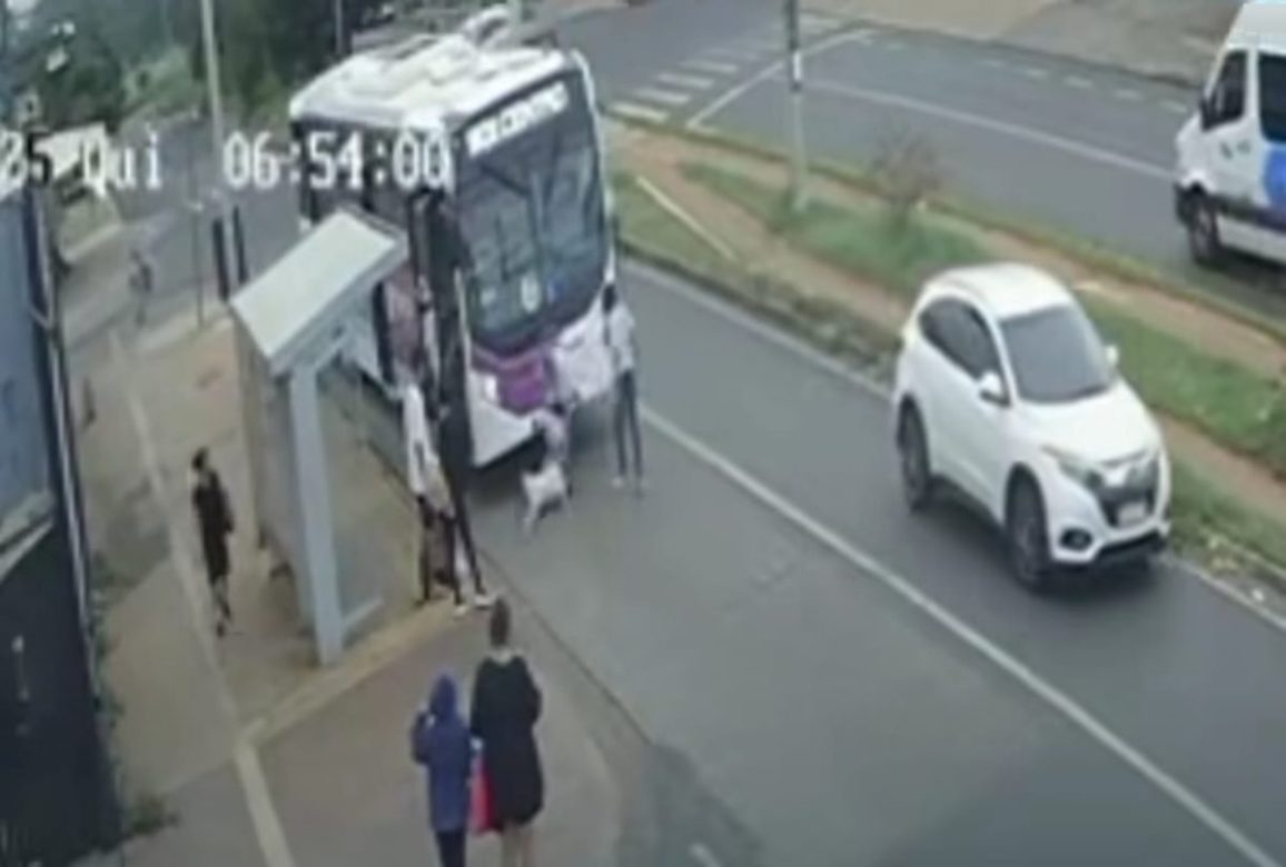 Na imagem de câmeras de segurança é possível ver o motorista e uma passageira tentando tirar o animal da frente do veículo, logo após ele ter sido atingido. O cachorro, aparentemente assustado e ferido, corre para a calçada e tenta se esconder embaixo do ônibus.