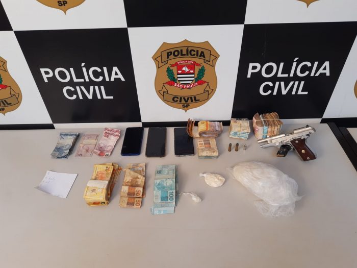 Dinheiro, celulares, arma e drogas apreendidos durante prisão do suspeito em Guariba (Foto: Divulgação DIG/DEIC Ribeirão)