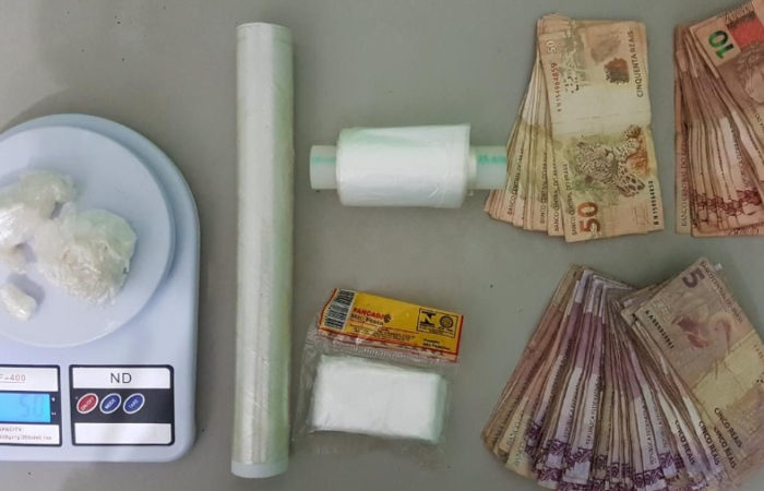 Os militares apreenderam 87 gramas de cocaína, balança de precisão, material para embalar a droga, um celular e R$ 1,9 em espécie.