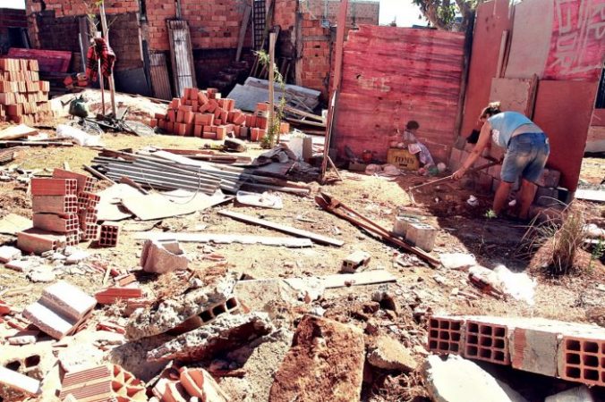 Um trator foi utilizado para fazer a derrubada das casas e barracos e cerca de 15 famílias, que estavam construindo moradias no local, tiveram que deixar a área.