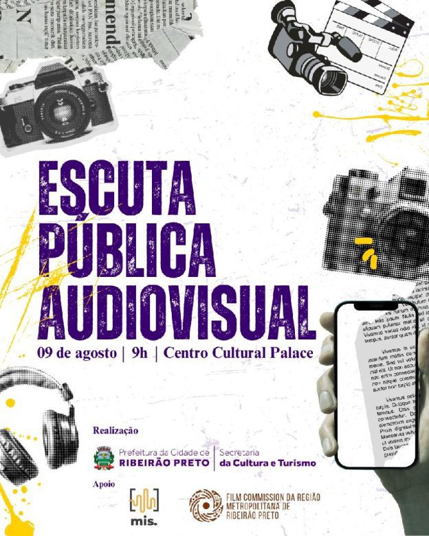 A Prefeitura de Ribeirão Preto, por meio da Secretaria da Cultura e Turismo, promove neste sábado, 9 de agosto, às 9h, no Centro Cultural Palace, uma escuta pública dedicada ao setor audiovisual. A atividade integra o processo democrático de formulação das políticas culturais do município e é voltada exclusivamente a profissionais, coletivos, produtores, realizadores e demais agentes da cadeia audiovisual local.