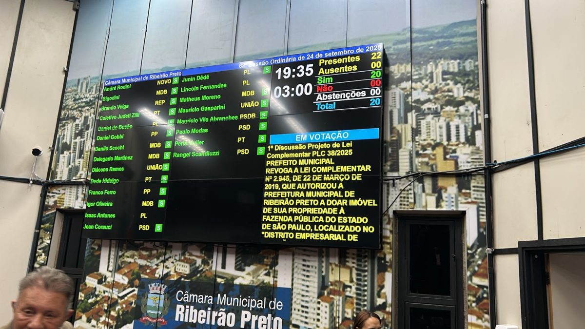 A Câmara de Vereadores aprovou, na sessão desta quarta-feira, 24 de setembro, por unanimidade entre os presentes (20 votos), projeto da prefeitura de Ribeirão Preto que revoga a lei complementar nº 2.945, de 22 de março de 2019 – autorizou a doação de terreno para o governo de São Paulo, na primeira etapa do Distrito Empresarial Prefeito Luiz Roberto Jábali, visando a construção de uma base do 9º Grupamento de Bombeiros.