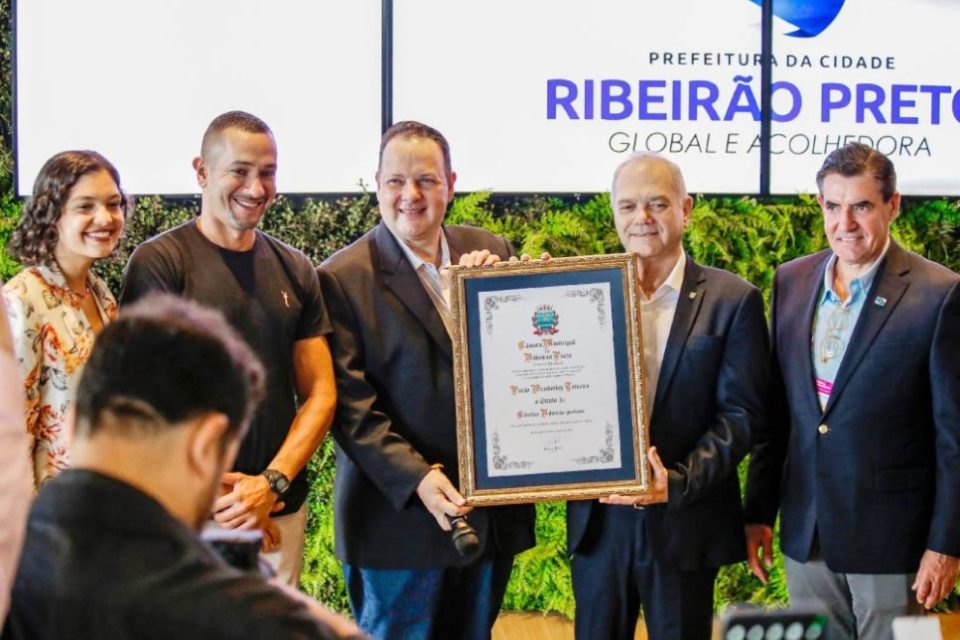 O prefeito Duarte Nogueira (PSDB) participou, na manhã desta terça-feira, 5 de setembro, no Centro de Eventos Taiwan, onde está o Centro de Convivência dos Jogos da Juventude, da entrega de título de cidadão ribeirão-pretano ao presidente do Comitê Olímpico do Brasil (COB), Paulo Wanderley Teixeira. A homenagem partiu do vereador André Trindade (União Brasil), que conduziu a solenidade e contou com a presença de outros parlamentares, autoridades e do comitê organizador do COB.