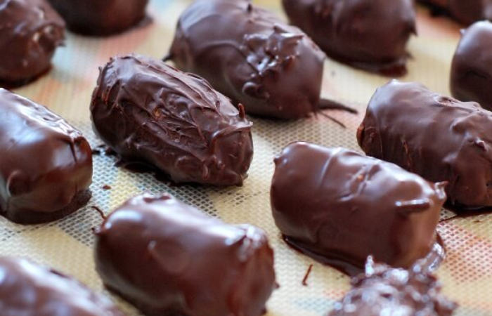 4. Retire seus rolinhos do congelador e banhe-os no chocolate com auxílio de um garfo (existem garfos especiais para fazer bombons).