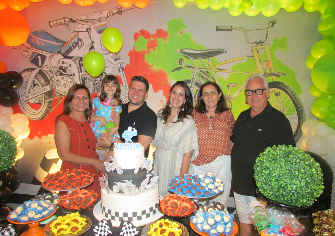 Co-assessorado pelos pais Tatiana e Victor Hugo Brandani e pela irmãzinha Valentina Quevedo Brandani, Victor Hugo, apagou sua primeira velinha em almoço repleto de detalhes no Espaço Branville.