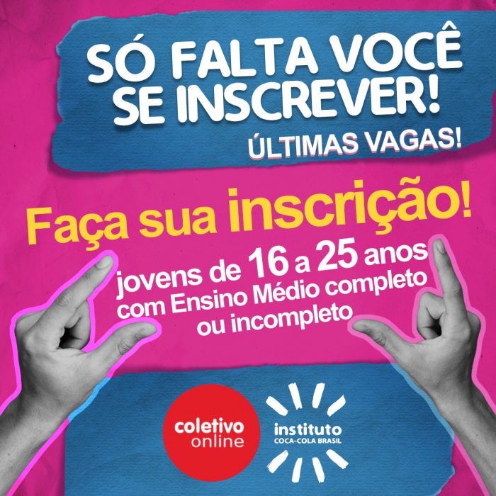 O Coletivo Online, projeto 100% digital da Plataforma Coletivo Jovem, do Instituto Coca-Cola Brasil (ICCB), está com inscrições abertas até o dia 07/11. O programa capacita e conecta jovens de 16 a 25 anos, moradores de comunidades de baixa renda, com oportunidades no mercado de trabalho através de uma rede de mais de 400 parceiros empregadores.