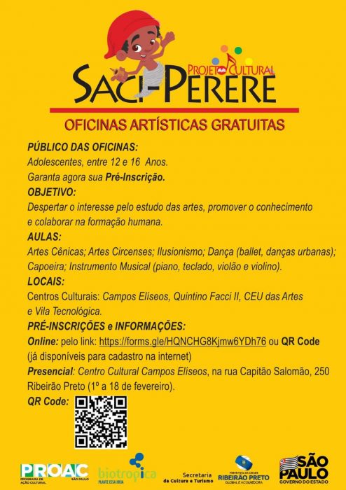 A arte aliada ao desenvolvimento profissional e humano. É o que pretende o projeto Saci Pererê Cultural, que está oferecendo 380 vagas gratuitas em oficinas de artes cênicas, circenses, ilusionismo, ballet, danças urbanas, capoeira, violino, piano, teclado e violão, direcionadas aos adolescentes de Ribeirão Preto, entre 12 e 16 anos.
