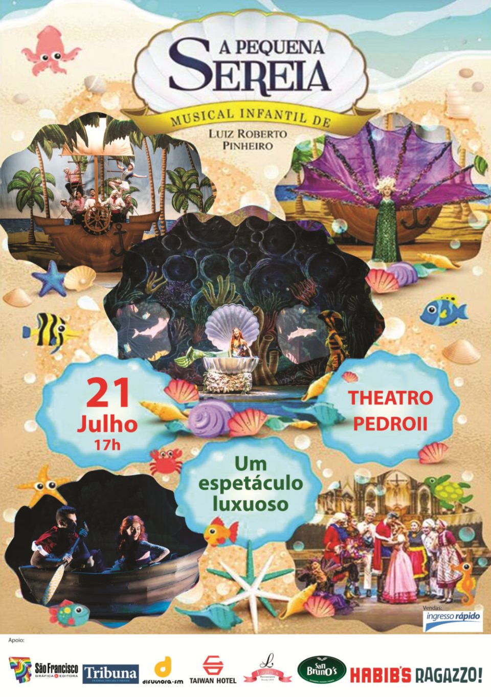 Sinopse: A Pequena Sereia é o novo musical de Luiz Roberto Pinheiro. O conto tem uma nova adaptação para os palcos, totalmente desvinculada da conhecida versão Disney, numa montagem encantadora para toda a família com o selo de qualidade da Pinheiro Produções Artísticas, são 05 músicas originais tem os arranjos e melodias de Can Kambay, 12 cenários, efeitos especiais deslumbrantes, figurinos luxuosos e a participação especial da atriz Lara Brito que desta vez é a antagonista da história. Você vai se apaixonar! Inspirado na literatura de Hans Christian Andersen, conta a história de uma linda Sereiazinha que vive no fundo do mar com sua família, e tem como melhores amigos um peixinho Linguado, e um golfinho Travesso. Quando a Sereiazinha completa quinze anos, ela é autorizada em ir até a superfície do mar. Ao avistar na superfície um lindo Príncipe apaixona-se por ele. Disposta a conquistar o amor do Príncipe Henry, a Pequena Sereia cede aos encantos da Bruxa do Mar e entrega sua bela voz em troca de um par de pernas, que a torne humana.  Ao se tornar humana, a Sereia encontra com o príncipe, que se apaixona por sua graça e beleza, mesmo estando ela muda, iniciando assim uma divertida e romântica aventura.