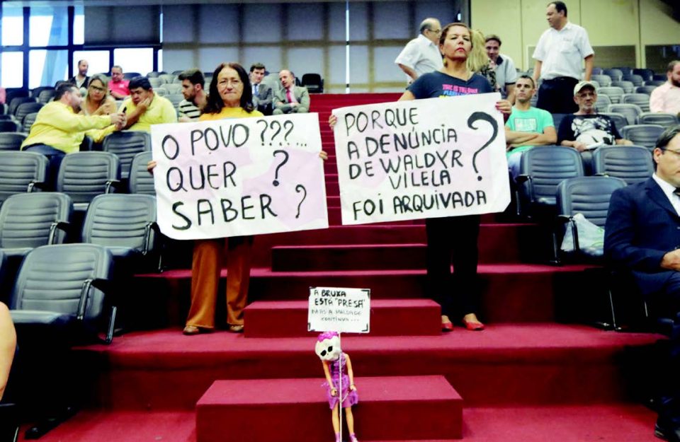Duas munícipes levaram cartazes e uma boneca cor-de-rosa à Câmara, nesta terça-feira, 31 de outubro, para protestar contra o arquivamento da denúncia de quebra de decoro parlamentar contra o vereador afastado Waldyr Villela (PSD). Na segunda-feira (30), o Conselho de Ética decidiu, por unanimidade, engavetar a representação. O processo foi aberto após a Polícia Civil instaurar, a pedido do Grupo de Atuação Especial de Repressão ao Crime Organizado (Gaeco), inquérito para investigar o parlamentar pela suposta prática de cinco crimes.