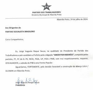 O presidente do Partido dos Trabalhadores e pré-candidato à prefeitura de Ribeirão Preto, pela coligação “Amor por Ribeirão”, Jorge Roque, encaminhou um ofício, cobrando oficialmente a adesão do PSB à coligação de frente esquerda na cidade. A coligação é composta pelo PT, PCdoB, REDE, PSOL, UP, PCB e PMB. Na última segunda-feira (22), Suely Vilela anunciou seu apoio à coligação encabeçada por Ricardo Silva, que reúne PSD, MDB, PL, Republicanos e PP.