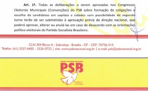 O pedido do PT está baseado numa resolução do próprio PSB, que define a aliança em nível nacional e atenta que qualquer decisão, em âmbitos municipais tenham que ser submetidas à cúpula do partido. A Resolução CEN 001/2024, do PSB, de 11/04/2024, estabelece que “todas as deliberações dos Congressos Eleitorais Municipais (Convenções) do PSB sobre formação de coligações e escolha de candidatos em capitais e cidades com possibilidade de segundo turno terão que ser submetidas à aprovação prévia da direção nacional, que poderá aprovar, alterar, ou anulá-las em caso de desacordo com as orientações político-eleitorais do Partido Socialista Brasileiro”.