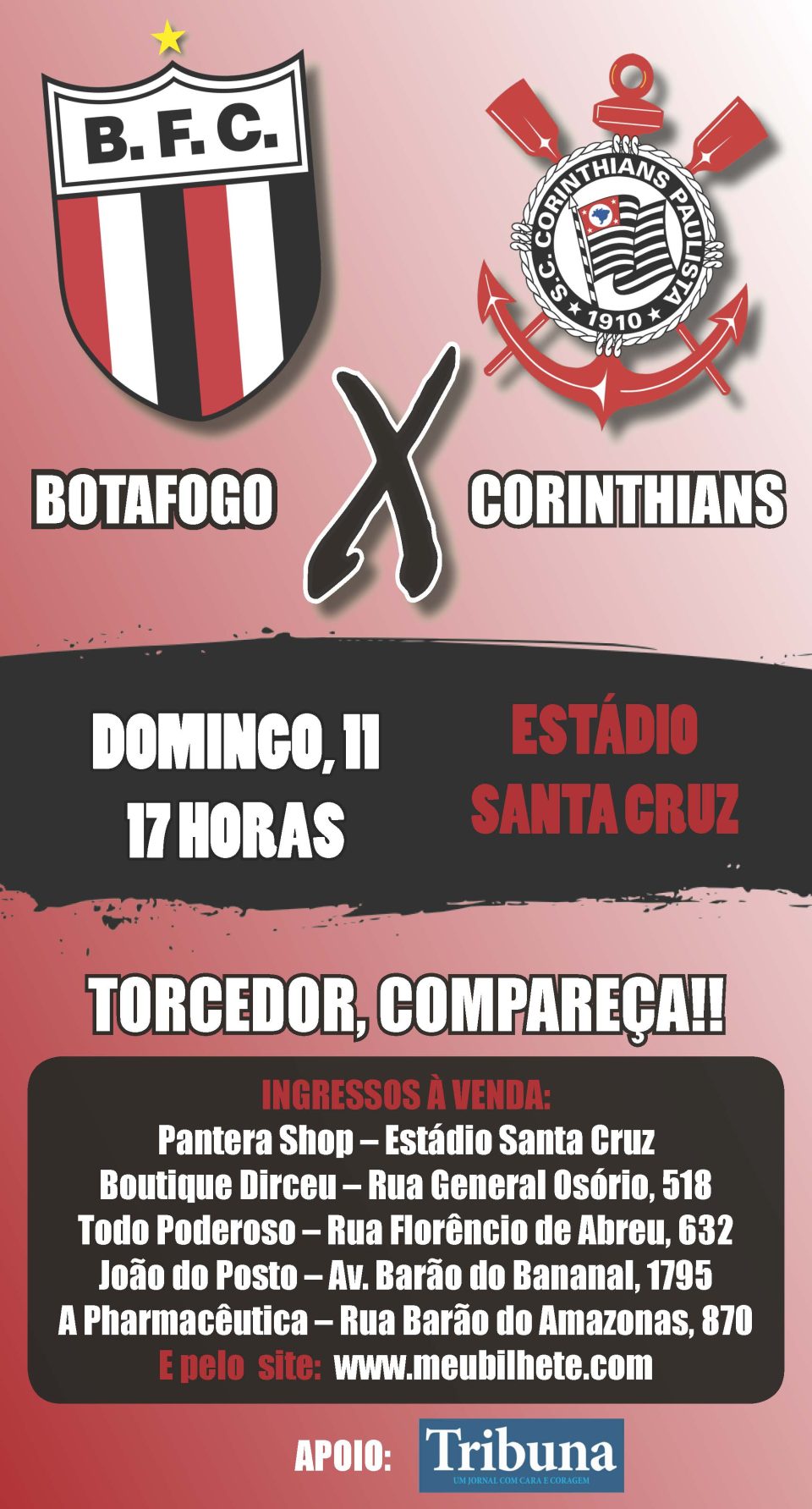 GeralPUBLICIDADE: Botafogo X Corinthians – Domingo – 17 horas – Estádio Santa Cruz 10 de março de 2018 12:50 Compartilhar0