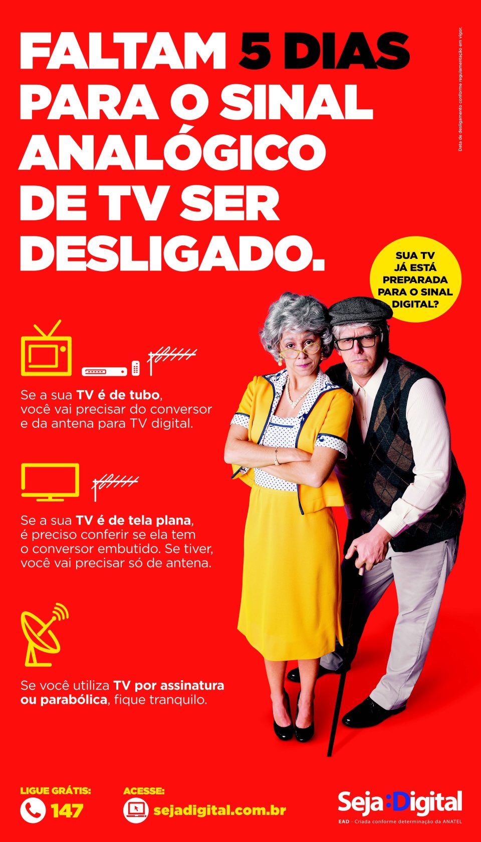 GeralPUBLICIDADE: EAD – Faltam 5 dias para o sinal analógico de TV ser desligado. 24 de novembro de 2017 10:50 Compartilhar0