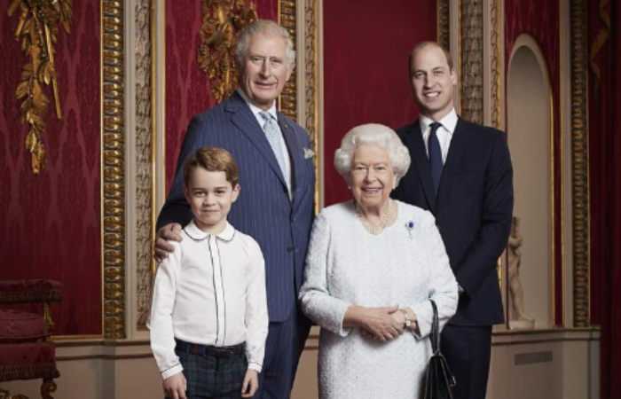 Junto à rainha, aparecem o príncipe Charles, primeiro na linha de sucessão ao trono, o príncipe William, segundo, e o príncipe George, terceiro. A fotografia foi tirada na sala do trono no Palácio de Buckingham, em Londres.