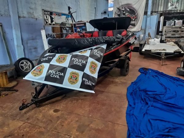 Em diligências no comércio, o proprietário autorizou vistoria, na qual foi possível localizar uma lancha do tipo Jetboat, uma lona marítima e uma carreta (reboque) de transporte, que o responsável não soube indicar a procedência, alegando que teriam sido deixados no local para serem realizaram algumas modificações.