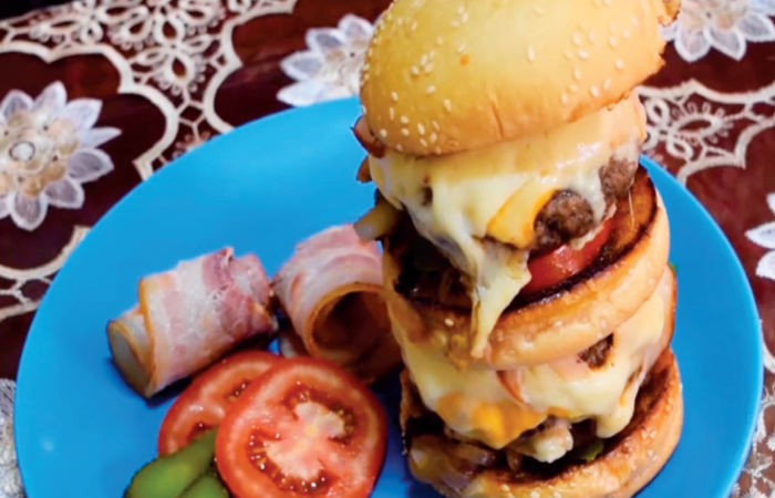 - Recoloque seu hambúrguer na frigideira com as fatias de queijo sobre ele, despeje uma xícara de café de água sobre ele e tampe por 2 minutos.