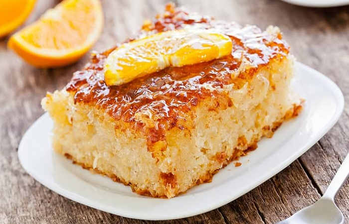7. Desenforme o bolo, faça vários furos com um garfo e cubra com a calda ainda quente antes de servir!
