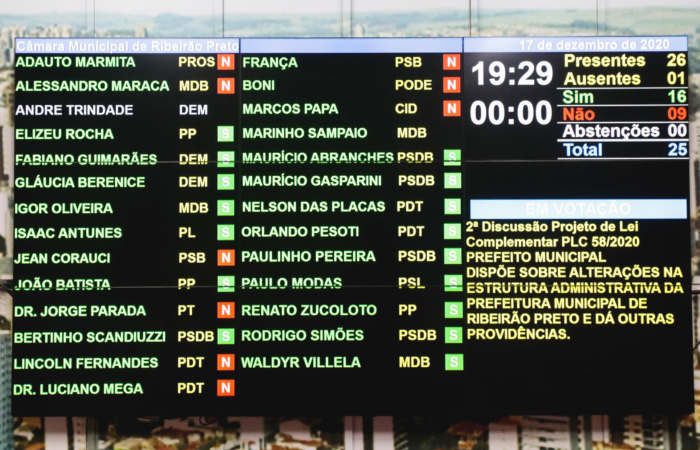 A matéria entrou na pauta porque o Legislativo aprovou em plenário requerimento de urgência especial proto­colado por Rodrigo Simões (PSDB). Foram 16 votos fa­voráveis à reforma adminis­trativa e nove contrários. O vereador André Trindade (DEM), líder do governo no Legislativo, não participou da sessão. Ele está afastado e in­ternado com covid-19.