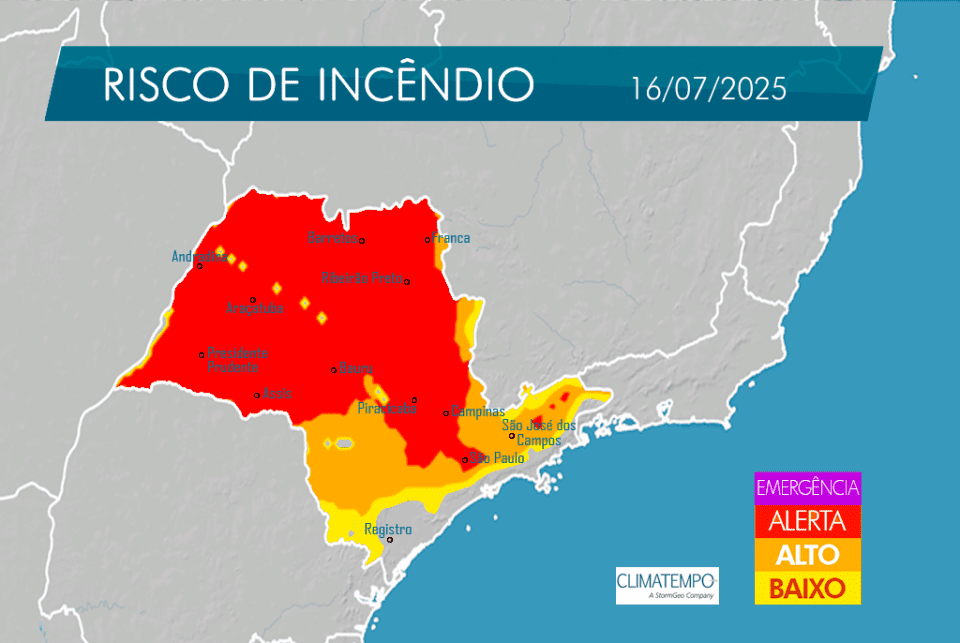 Nos próximos dias, quase todo o estado de São Paulo estará em estado de atenção para incêndios. O risco é elevado principalmente nesta quinta (17) e na sexta-feira, 18 de julho, quando a baixa umidade relativa do ar, as temperaturas elevadas e o predomínio do Sol intensificam as chances de queimadas em todas as regiões paulistas.