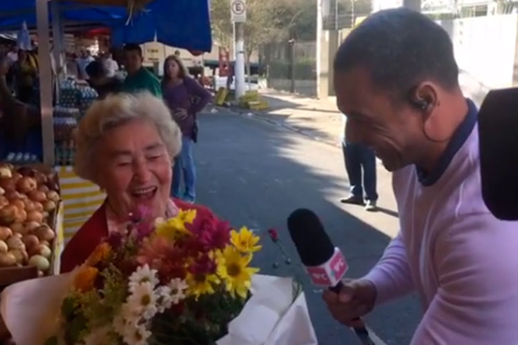 O repórter resolveu presenteá-la com um buquê de flores: “Essa história mexeu muito comigo. Infelizmente, hoje, não tenho ninguém pra chamar de vó. Minhas avózinhas estão todas lá (aponta para o céu), já foram embora. Por conta disso, dessa repercussão toda, o Louro (José, personagem do programa), a Ana, eu, a gente queria homenagear a senhora, pedir desculpas pelo susto e homenagear todas as vovós do Brasil”. “Obrigada! Adoro flores!”, encantou-se Regina.