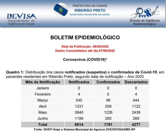 Ribeirão Preto chegou hoje à marca de 44 mortos por Covid-19. Os dados são do Boletim Epidemiológico do Departamento de Vigilância em Saúde, da Secretaria Municipal da Saúde (SMS), divulgados na tarde desta segunda-feira (8/Jun).