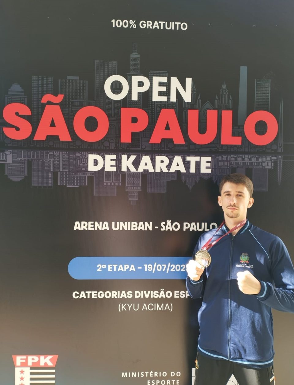 O carateca João Sampaio, atleta de Ribeirão Preto, conquistou a medalha de bronze no Open São Paulo de Caratê, no último sábado (19), na capital paulista. O atleta celebrou o pódio na categoria Kata Sênior do torneio, que teve mais de 500 inscrições e a participação de 103 associações do estado.