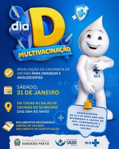 A Prefeitura de Ribeirão Preto, por meio da Secretaria da Saúde, promove neste sábado, 31, o Dia D de Multivacinação, com atendimento em todas as 39 salas de vacina do município, das 8h às 16h30. A ação tem como principal objetivo atualizar a caderneta de vacinação de crianças e adolescentes.