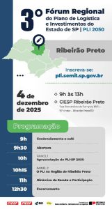 O Governo do Estado de São Paulo, por meio da Secretaria de Meio Ambiente, Infraestrutura e Logística (Semil), promove na quinta-feira (04/12) o 3º Fórum Regional do Plano de Logística e Investimentos – PLI-SP 2050, em Ribeirão Preto. O PLI-SP 2050 é uma iniciativa estratégica que orienta onde, como e quando o Estado e a iniciativa privada devem investir para construir, até 2050, um sistema logístico moderno, eficiente e sustentável. O plano articula rodovias, ferrovias, hidrovias, dutos, portos e aeroportos sob uma visão integrada de desenvolvimento econômico, social e ambiental, conectando planejamento, investimentos e políticas públicas de longo prazo.