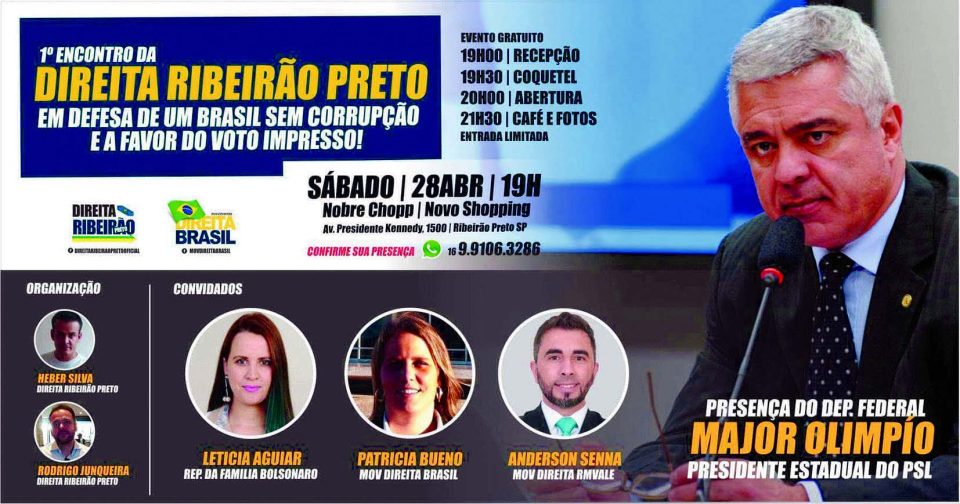 Integrantes de vários movimentos sociais vão promover neste sábado o “1º Encontro da Direita Ribeirão Preto – Em Defesa de Um Brasil Sem Corrupção e a Favor do Voto Impresso”. O encontro acontecerá no Nobre Chopp, do Novo Shopping, com um almoço às 12 horas e um coquetel a partir das 19 horas.