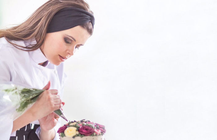 Autodidata, aprendeu o Flower Cake depois de assistir vídeos na internet. A técnica consiste na confecção de flores de creme de manteiga translúcido ou de chantili de leite em pó.