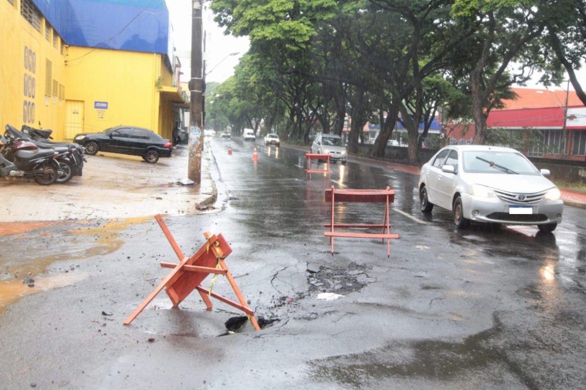 Asfalto cedeu na manhã desta segunda-feira (9), na avenida Francisco Junqueira (Foto: Alfredo Risk)