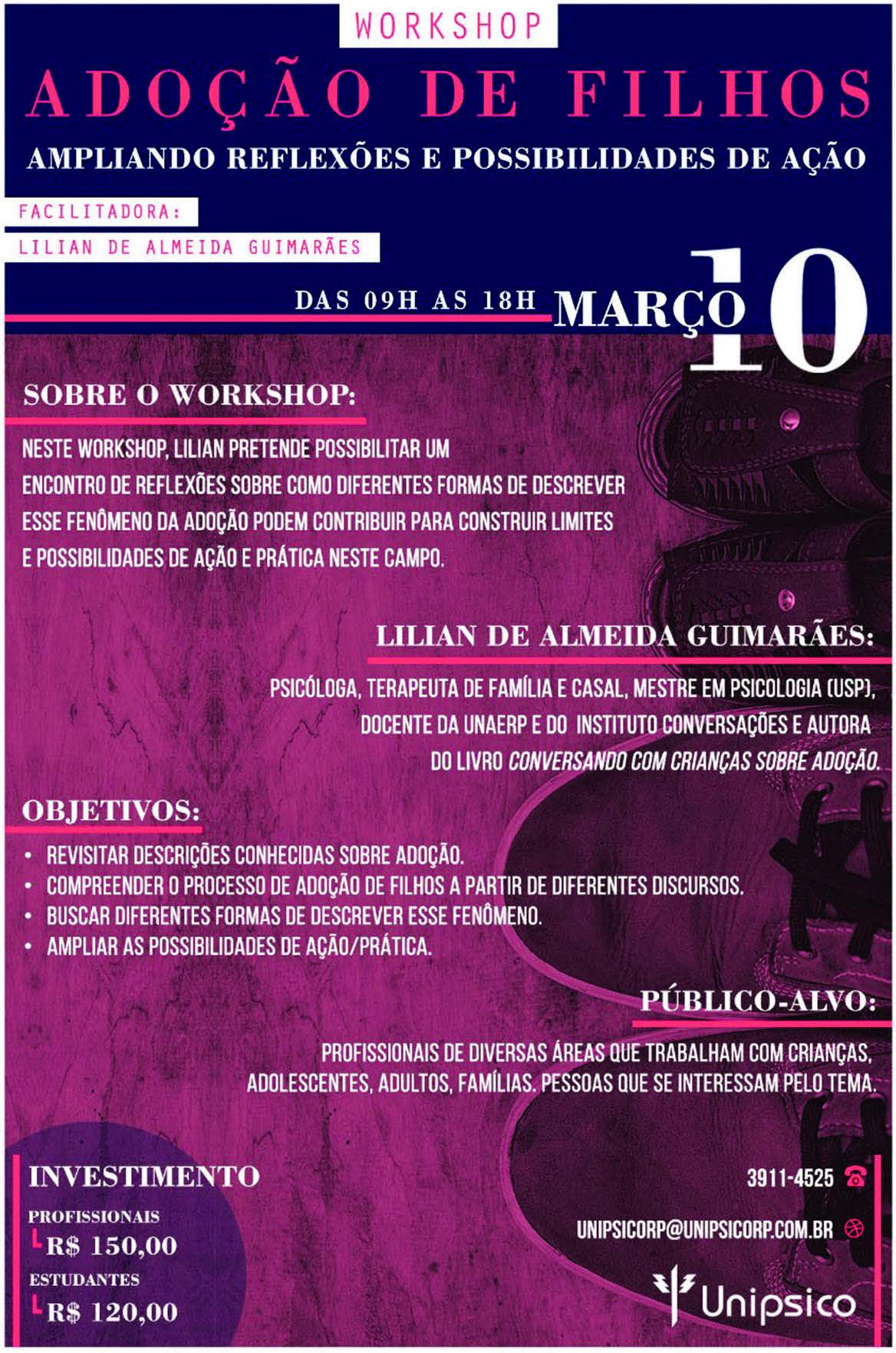 A Cooperativa de Trabalho de Psicólogos de Ribeirão Preto (Unipsico) vai promover, neste sábado (10), das 9 às 18 horas, um workshop com o tema: Adoção de filhos: ampliando reflexões e possibilidades de ação. O evento tem como objetivo promover encontros e fomentar conversas e reflexões sobre conhecimentos e temas relacionados à nossa vida e terá como facilitadora a psicóloga Lilian de Almeida Guimarães.
