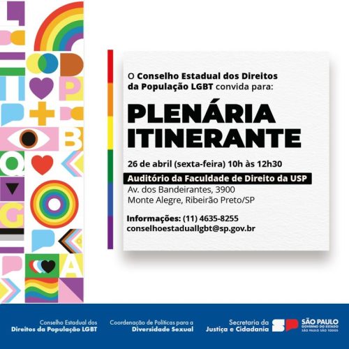 Representantes do Conselho Estadual dos Direitos da População de Lésbicas, Gays, Bissexuais, Travestis e Transexuais, estão em Ribeirão Preto pela primeira vez para realizar a plenária itinerante da entidade. O evento acontece nesta sexta, dia 26, das 10h às 12h30, no auditório da Faculdade de Direito da USP, na avenida dos Bandeirantes, 3900, no Monte Alegre, região oeste da cidade.