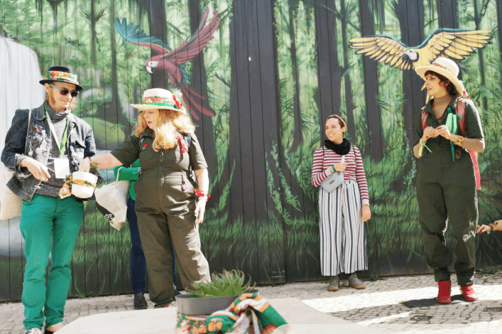 Ao longo do percurso, histórias, memórias e leituras tecem uma narrativa sensível que busca através do jogo e da observação, produzir outras relações entre os humanos e os não-humanos no espaço público. Ao final do trajeto a caminhada transforma-se em uma celebração, e os participantes são convidados a escrever suas ideias para adiar o fim do mundo, em bandeirinhas que são colocadas no espaço.