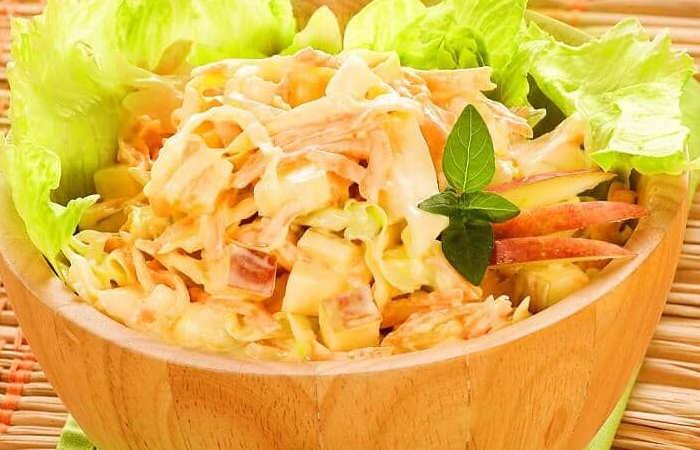 1. Em uma tigela grande misture as maçãs, as cenouras e o repolho.