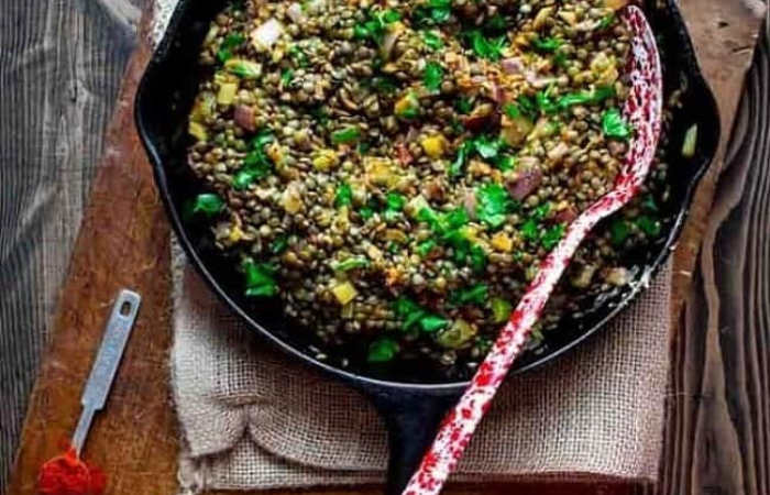 5. Acrescente as lentilhas cozidas, o vinagre, a páprica, a pimenta e a água. Cozinhe tudo mexendo muito bem.
