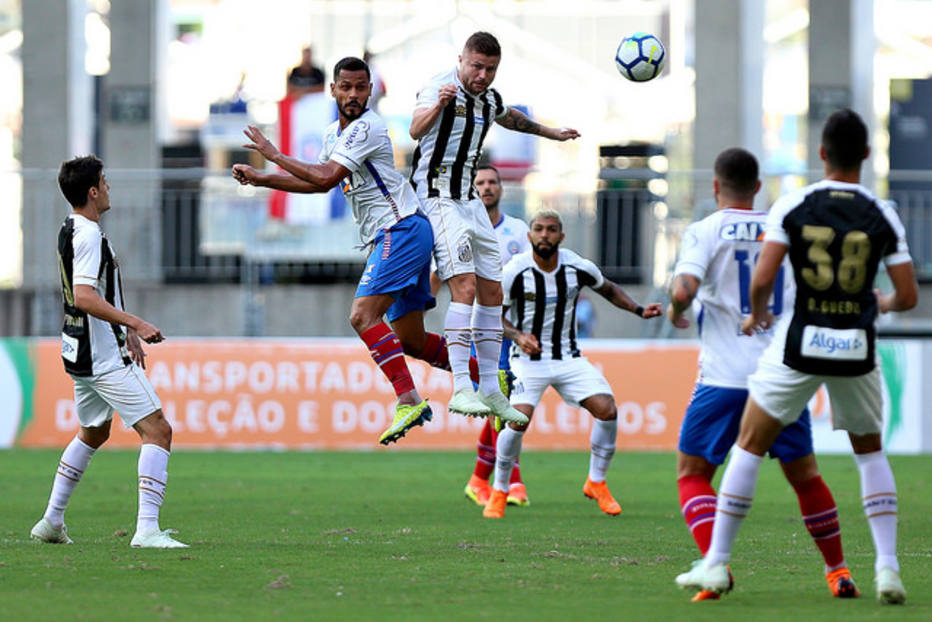 O JOGO – O início do jogo foi de sufoco e muitos sustos para o Santos. Com boas jogadas pelas laterais, especialmente pela esquerda, o Bahia impôs a condição de mandante e finalizou cinco vezes nos dez primeiros minutos de um duelo em que o time paulista encontrava dificuldades para sair jogando, o que só aumentava o cenário de pressão.