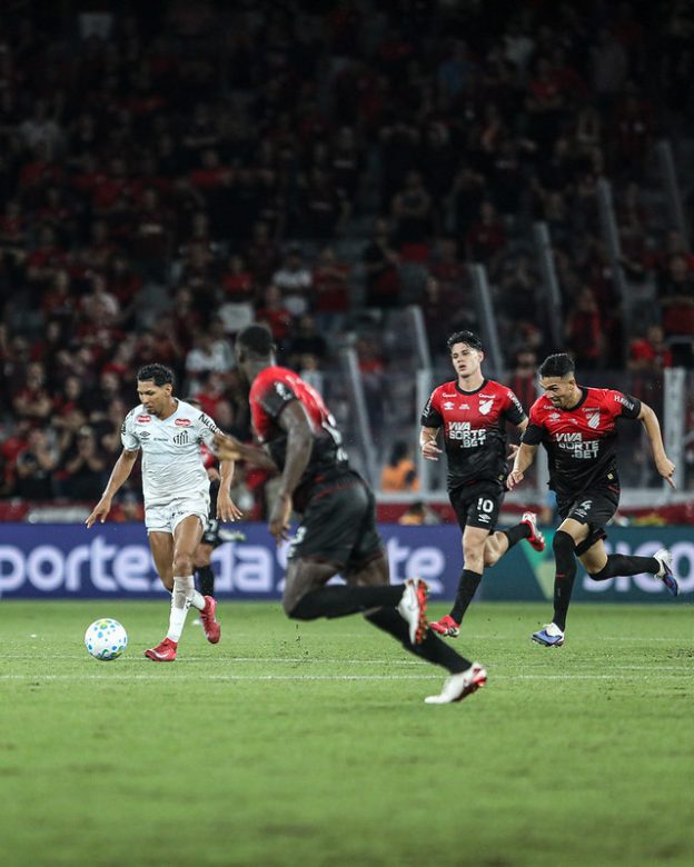 O Furacão não deu chance para o Santos respirar. Logo aos dois minutos, Viveros foi derrubado por Zé Ivaldo. O árbitro Ramon Abatti Abel foi ao VAR e confirmou o pênalti, convertido por Julimar, aos seis.