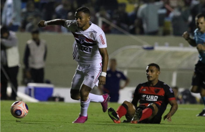 O São Paulo começou a partida ditando o ritmo, mas foi surpreendido aos seis minutos em um lance de bola parada. Brunão cobrou falta para dentro da área e Douglão cabeceou no canto de Matheus Cunha.